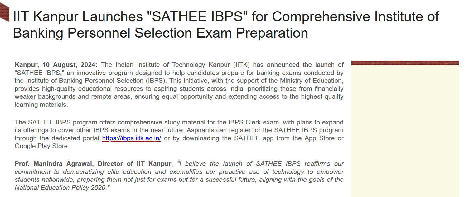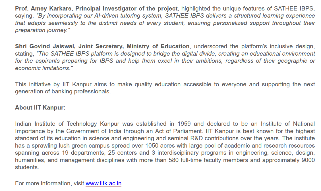 Kanpur, 10 August, 2024: The Indian Institute of Technology Kanpur (IITK) has announced the launch of “SATHEE IBPS,” an innovative program designed to help candidates prepare for banking exams conducted by the Institute of Banking Personnel Selection (IBPS). This initiative, with the support of the Ministry of Education, provides high-quality educational resources to aspiring students across India, prioritizing those from financially weaker backgrounds and remote areas, ensuring equal opportunity and extending access to the highest quality learning materials.