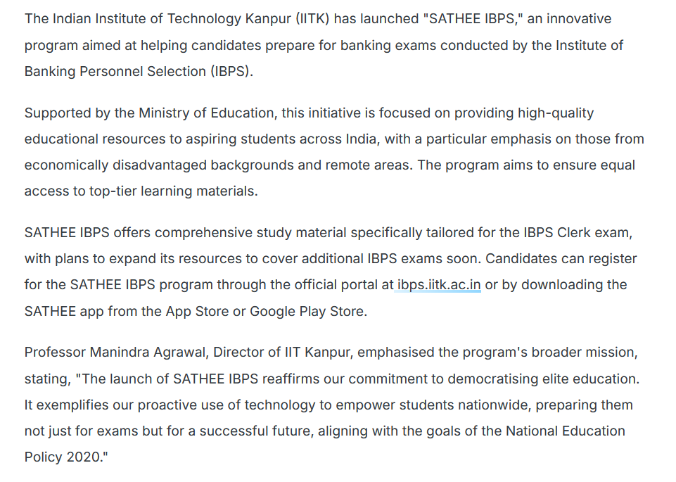 The Indian Institute of Technology Kanpur (IITK) has launched “SATHEE IBPS,” an innovative program aimed at helping candidates prepare for banking exams conducted by the Institute of Banking Personnel Selection (IBPS).