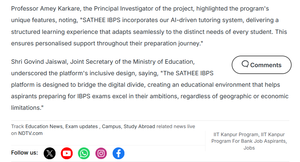 Professor Amey Karkare, the Principal Investigator of the project, highlighted the program’s unique features, noting, “SATHEE IBPS incorporates our AI-driven tutoring system, delivering a structured learning experience that adapts seamlessly to the distinct needs of every student. This ensures personalised support throughout their preparation journey.”