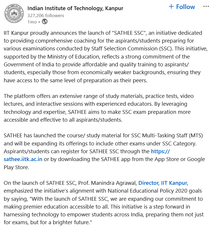 On the launch of SATHEE SSC, Prof. Manindra Agrawal, Director, IIT Kanpur, emphasized the initiative’s alignment with National Educational Policy 2020 goals by saying, “With the launch of SATHEE SSC, we are expanding our commitment to making premier education accessible to all. This initiative is a step forward in harnessing technology to empower students across India, preparing them not just for exams, but for a brighter future.”