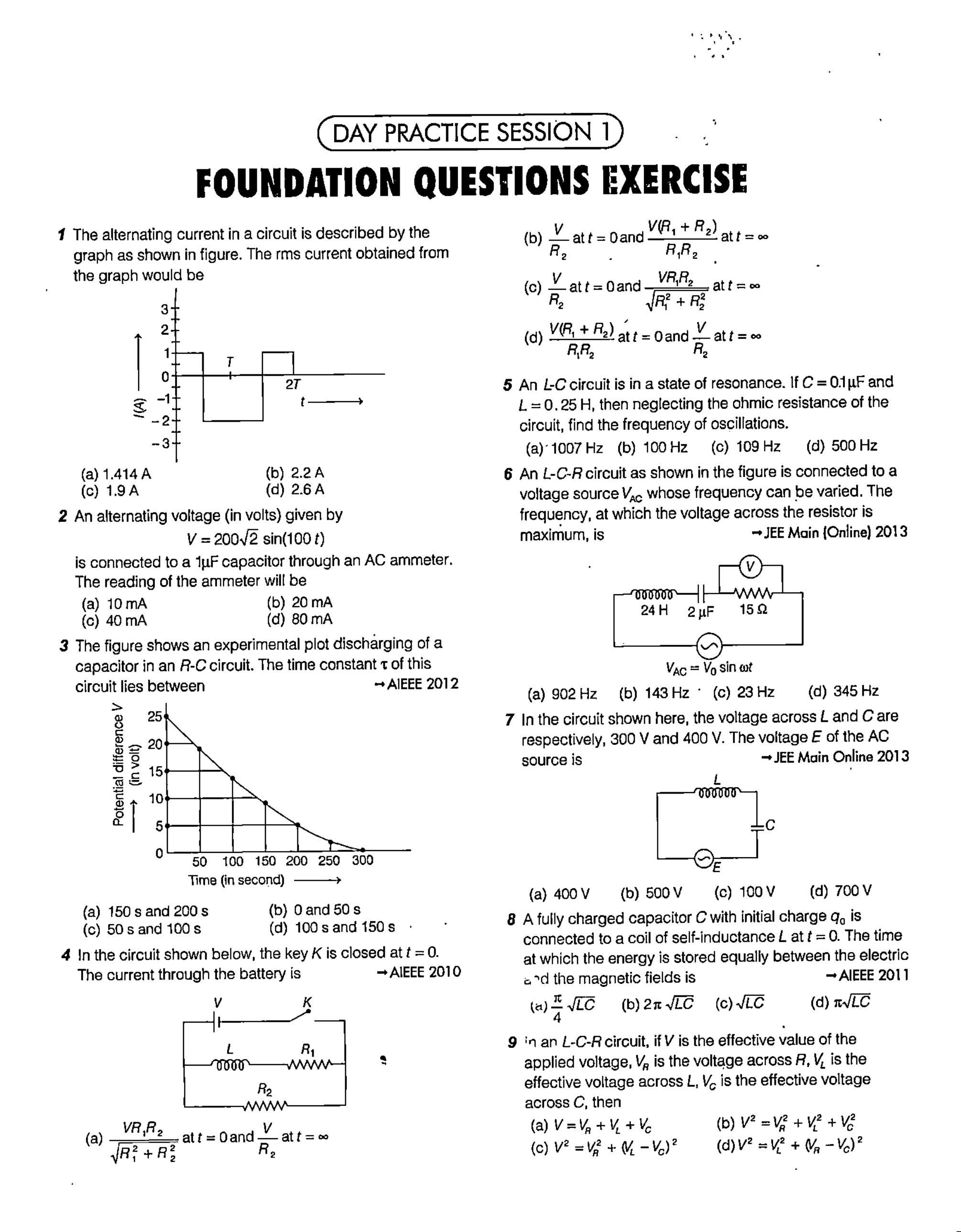##### एक प्रत्यावर्ती वोल्टेज (वोल्ट में) जो $V=200 \sqrt{2} \sin (100 t)$ द्वारा दिया गया है, को एक $1 \mu \mathrm{F}$ संधारित्र के साथ एक एसी एमीटर के माध्यम से जोड़ा गया है। एमीटर का पाठ्यांक होगा