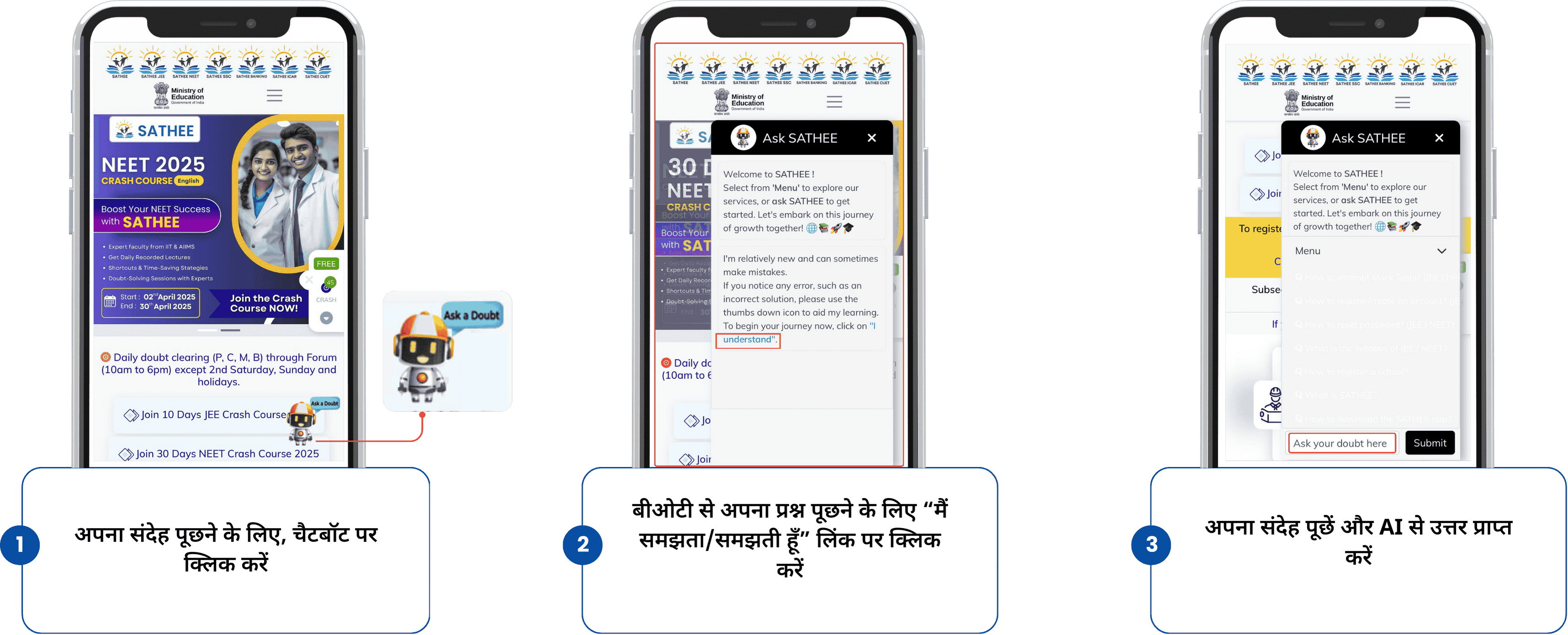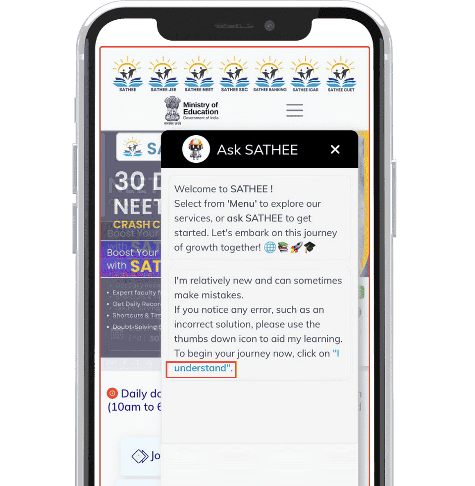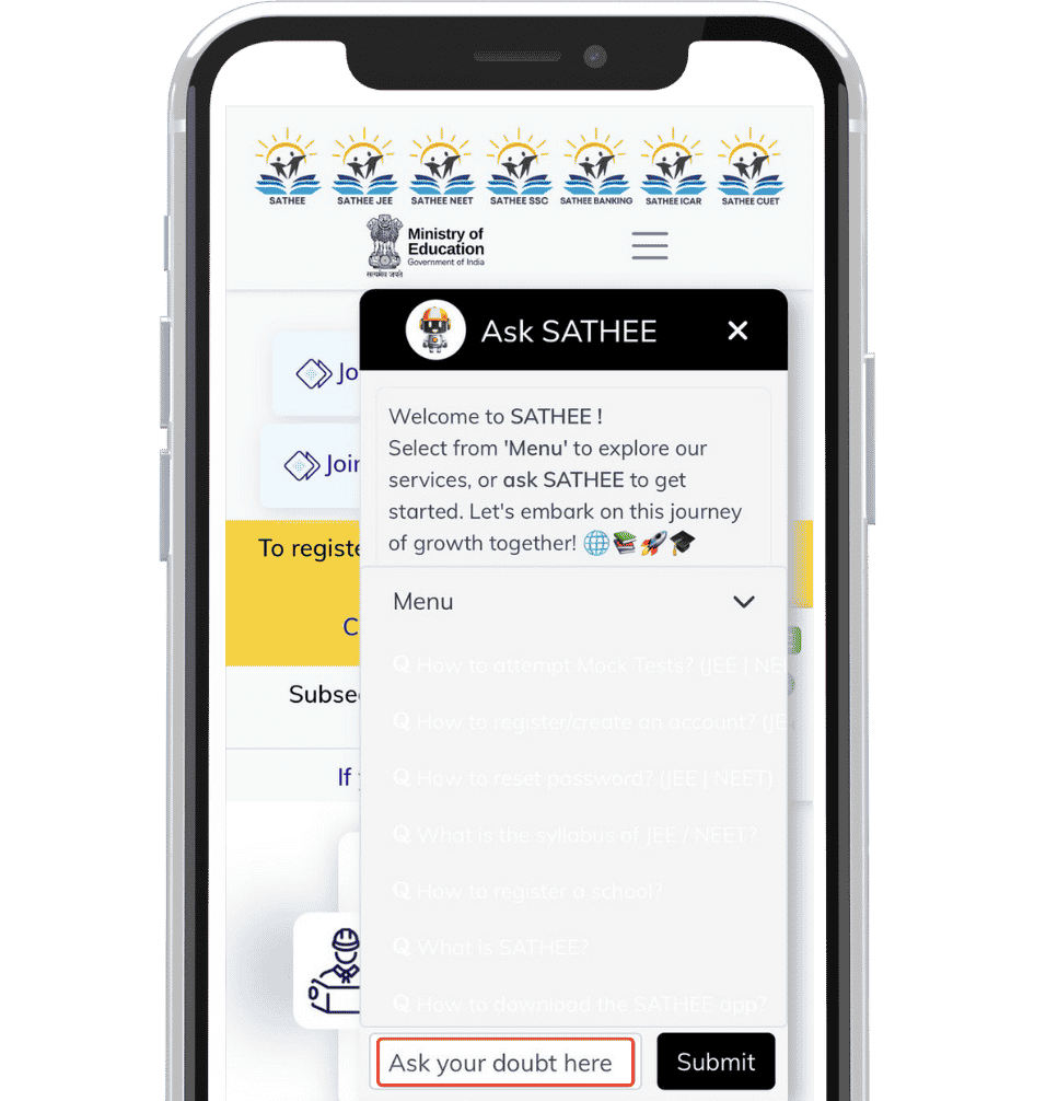 Select from 'Menu' to explore our services, or ask SATHEE to get started. Let's embark on this