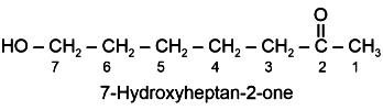 सबसे लंबी शृंखला पहचानें: सबसे लंबी शृंखला में सात कार्बन हैं, इसलिए इसे “हेप्टेन” अवतरण कहा जाता है। कार्बनिक समूह: हाइड्रॉक्सी समूह (−OH) सातवें कार्बन पर है। केटोन समूह $(−COCH_3)$ द्वितीय कार्बन पर है। यहां, -OH समूह एक प्रतिस्थापक समूह के रूप में कार्य करता है (उपसर्ग)। इसलिए, IUPAC नाम 7-हाइड्रॉक्सीहेप्टन-2-ओन है।