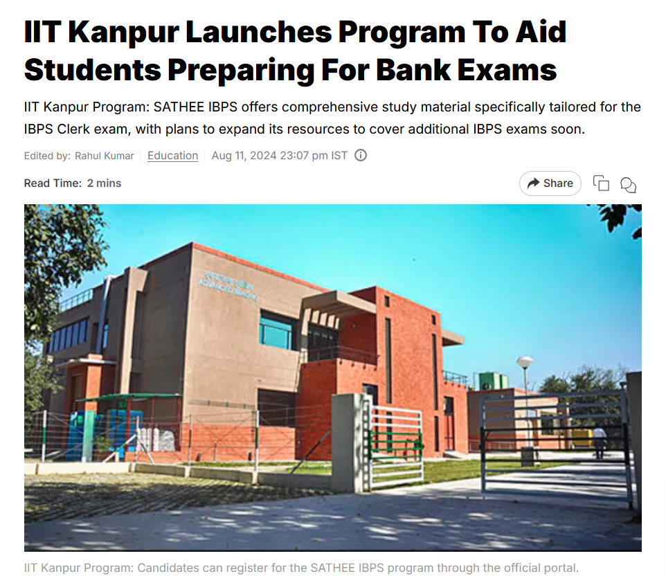IIT Kanpur Launches Program To Aid Students Preparing For Bank Exams IIT Kanpur Program: SATHEE IBPS offers comprehensive study material specifically tailored for the IBPS Clerk exam, with plans to expand its resources to cover additional IBPS exams soon. IIT Kanpur Program: Candidates can register for the SATHEE IBPS program through the official portal.