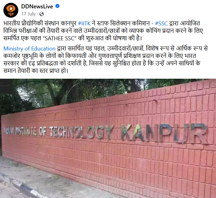 भारतीय प्रौद्योगिकी संस्थान कानपुर #IITK ने स्टाफ सिलेक्शन कमिशन - #SSC द्वारा आयोजित विभिन्न परीक्षाओं की तैयारी करने वाले उम्मीदवारों/छात्रों को व्यापक कोचिंग प्रदान करने के लिए समर्पित एक पहल “SATHEE SSC” की शुरुआत की घोषणा की है। Ministry of Education द्वारा समर्थित यह पहल, उम्मीदवारों/छात्रों, विशेष रूप से आर्थिक रूप से कमजोर पृष्ठभूमि के लोगों को किफायती और गुणवत्तापूर्ण प्रशिक्षण प्रदान करने के लिए भारत सरकार की दृढ़ प्रतिबद्धता को दर्शाती है, जिससे यह सुनिश्चित होता है कि उन्हें अपने साथियों के समान तैयारी का स्तर प्राप्त हो।