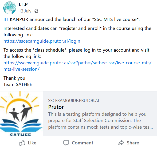 IIT KANPUR announced the launch of our SSC MTS live course. Interested candidates can register and enroll in the course using the following link: https://satheessc.iitk.ac.in/login To access the class schedule, please log in to your account and visit the following link: https://satheessc.iitk.ac.in/ssc?path=/sathee-ssc/live-course-mts/mts-live-session/ Thank you Team SATHEE