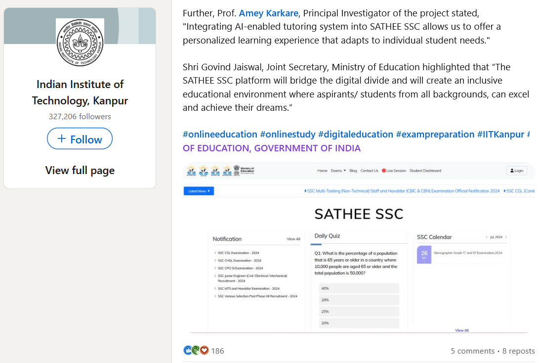 On the launch of SATHEE SSC, Prof. Manindra Agrawal, Director, IIT Kanpur, emphasized the initiative’s alignment with National Educational Policy 2020 goals by saying, “With the launch of SATHEE SSC, we are expanding our commitment to making premier education accessible to all. This initiative is a step forward in harnessing technology to empower students across India, preparing them not just for exams, but for a brighter future.”
